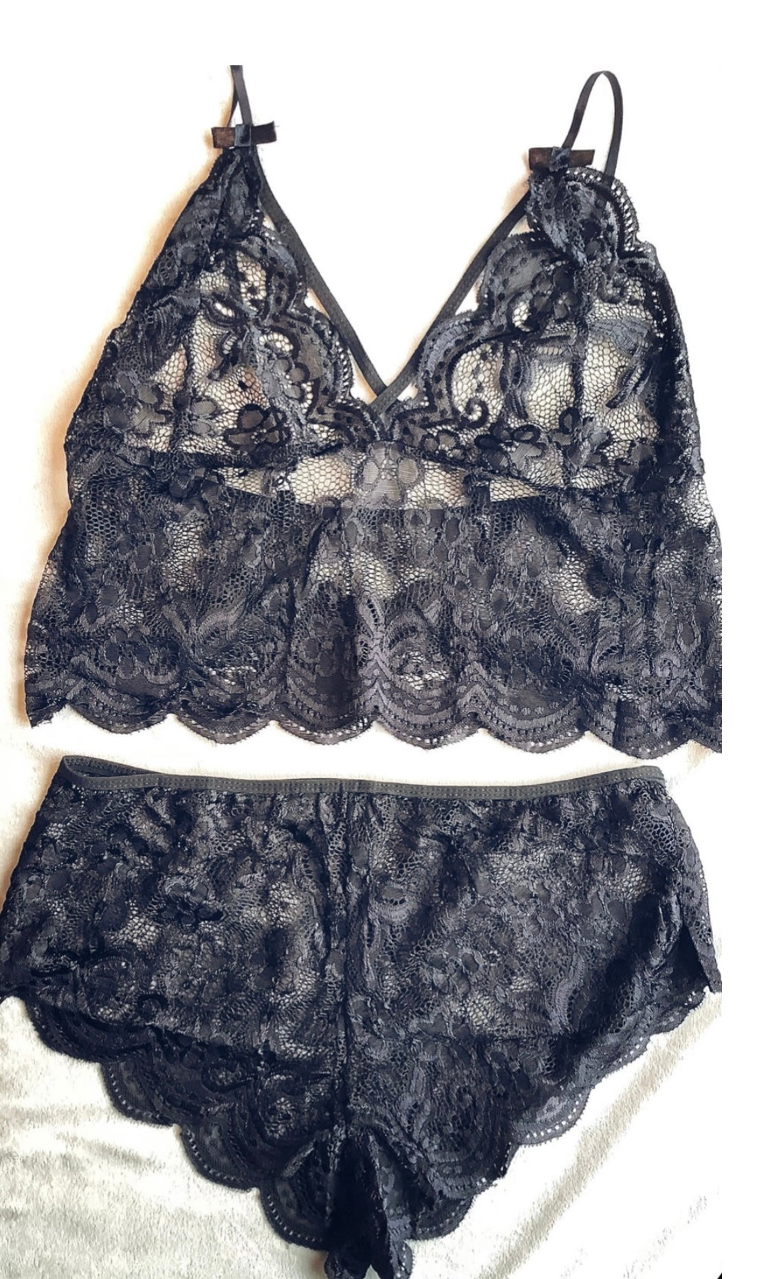 A beautiful set consisting of a delicate lace bralette and panty, both designed with a transparent finish for a sensual touch. Leg Garter not included